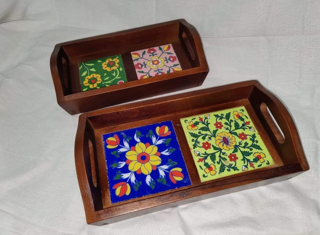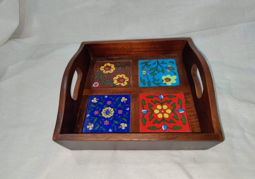Elevate your hosting with the exquisite Blue Pottery Elegance Serving Tray, crafted from beautiful ceramic tiles joined on a sturdy wooden base. Handcrafted in Jaipur, each tray showcases Rajasthan’s blue pottery artistry, with vibrant tiles arranged to create a striking and functional centerpiece. Perfect for formal gatherings or enhancing everyday decor, this tray brings warmth and sophistication to your table.